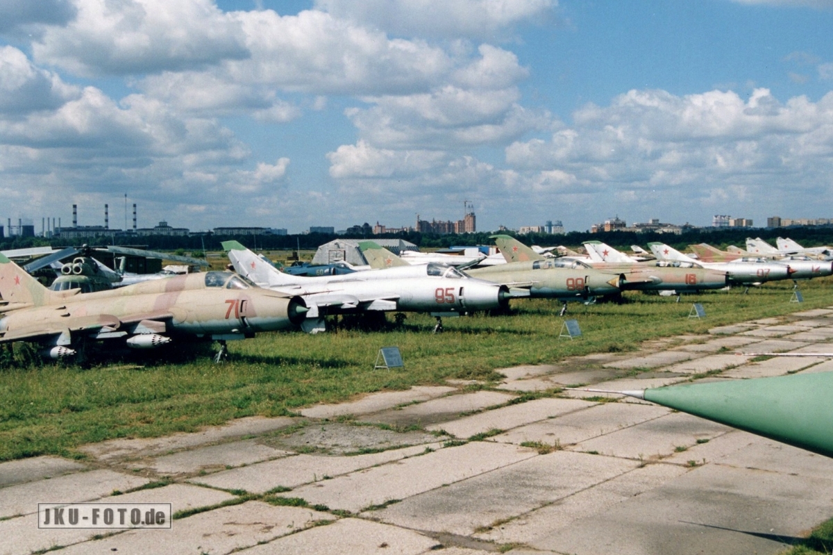 Blick über einen Teil der Flugzeuge der ehemaligen Ausstellung Flugplatz Chodinka, Moskau 2001, Analogfoto